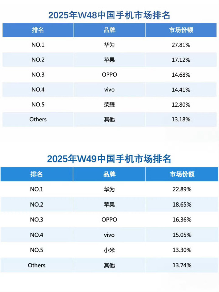 细节方面,2025年第48周(11月24日-30日),华为手机中国市场份额为27.81%,比苹果的17.12%份额高10.69个百分点,领先优势明显;第49周(12月1日-7日),华为以22.89%的市场份额继续制霸中国市场市场,苹果以18.65%的份额位居第二。